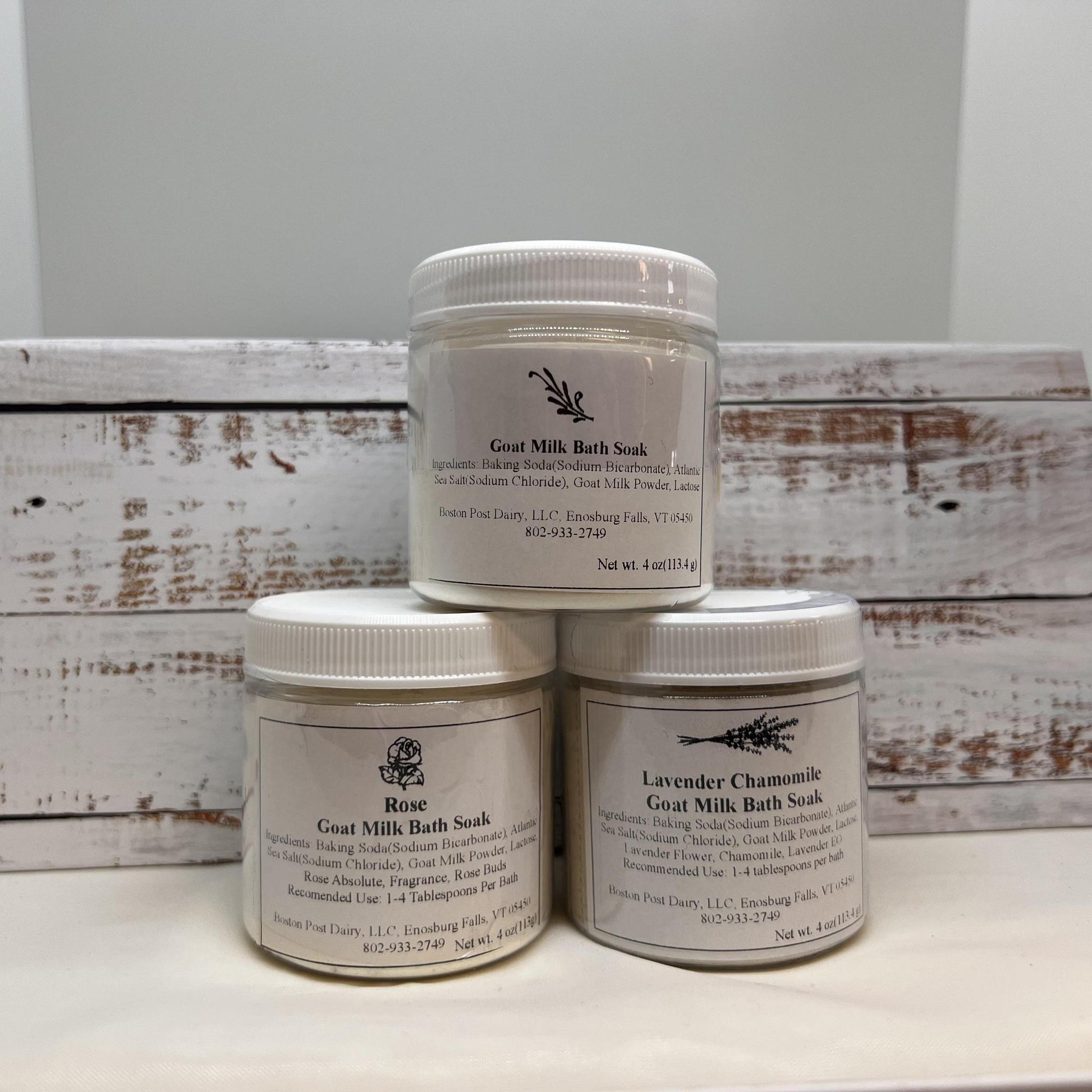 Luxurious Rose, Lavender Chamomile or Unscented Goat Milk Bath Soak 4 oz. relaxing bath spa. Oh the goodness of being pampered with a creamy Goats Milk Bath Soak! Goat's milk has been a prized beauty secret for centuries. It provides a natural source of lactic acid (alpha hydroxy acid), which is a rejuvenating natural exfoliator. It also boasts many vitamins and minerals to help support, balance and moisturize the skin. This soak is finely blended and dissolves instantly giving your skin the royal treatment!