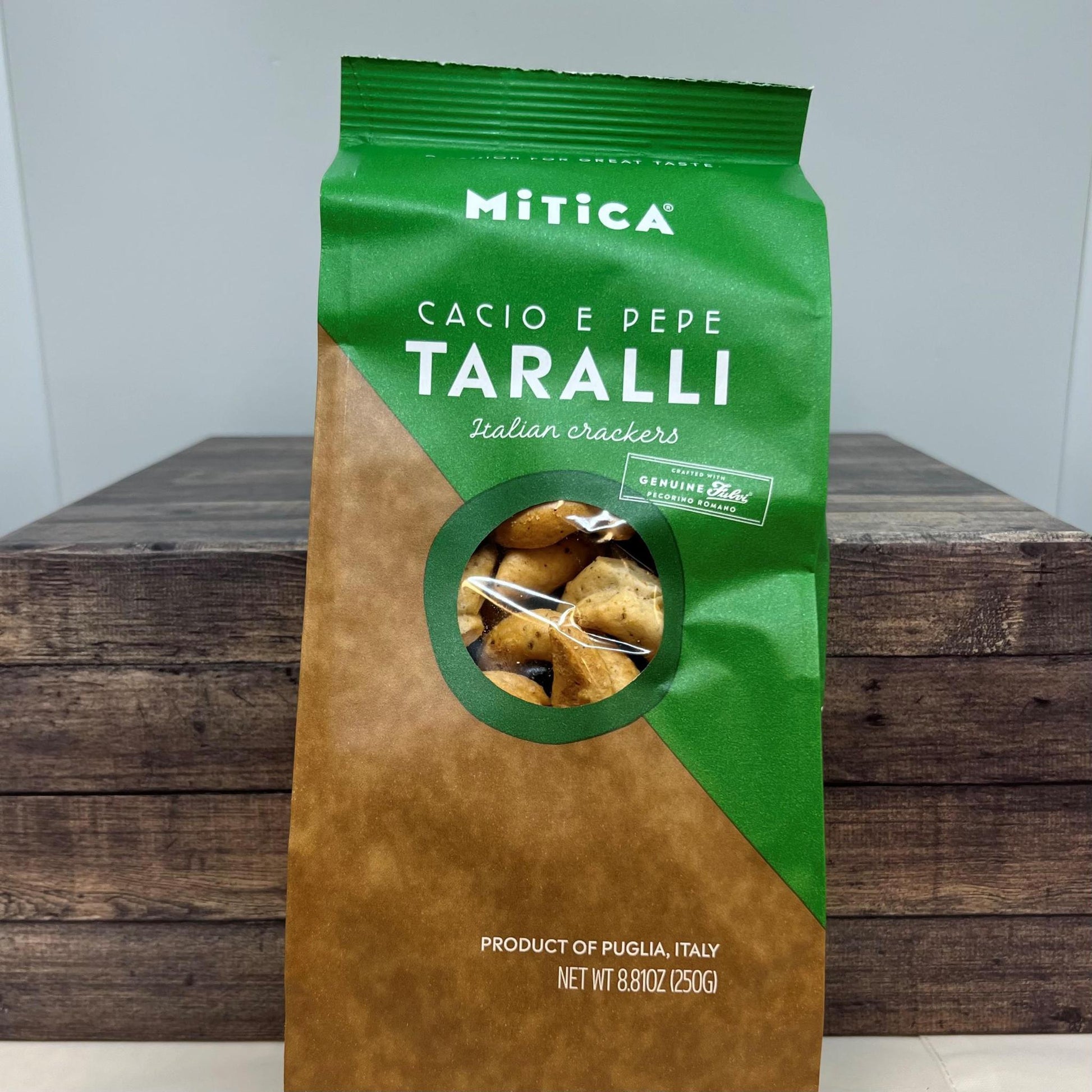 Cacio e Pepe Taralli Italian Crackers – 7 oz A timeless Italian flavor in a satisfyingly crunchy bite. These Cacio e Pepe Taralli crackers are a savory twist on the classic taralli, infused with the bold simplicity of Pecorino Romano cheese and cracked black pepper.