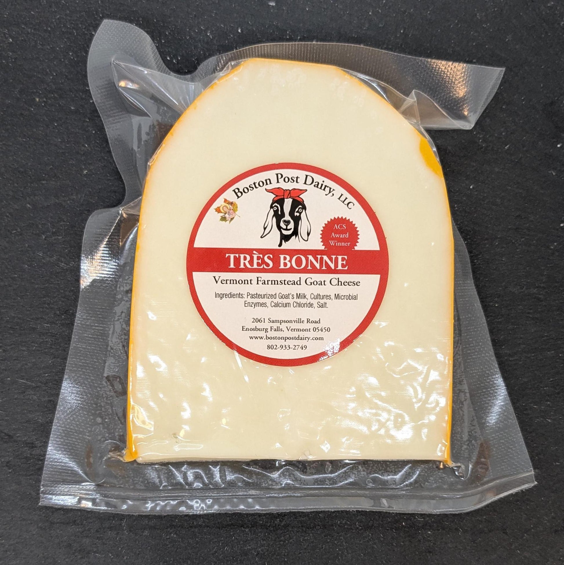 Tres Bonne is a goat milk Gouda aged 2-5 months. It's a smooth cheese and has a fresh mild and nutty flavor.